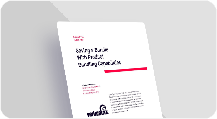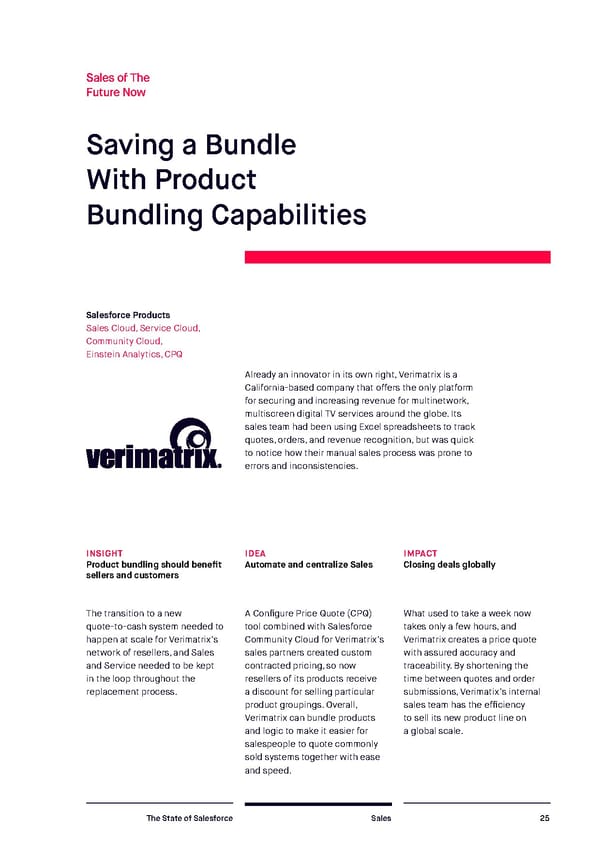 25 Sales Sales of The Future Now Already an innovator in its own right, Verimatrix is a California-based company that offers the only platform for securing and increasing revenue for multinetwork, multiscreen digital TV services around the globe. Its sales team had been using Excel spreadsheets to track quotes, orders, and revenue recognition, but was quick to notice how their manual sales process was prone to errors and inconsistencies. The transition to a new quote-to-cash system needed to happen at scale for Verimatrix’s network of resellers, and Sales and Service needed to be kept in the loop throughout the replacement process. A Configure Price Quote (CPQ) tool combined with Salesforce Community Cloud for Verimatrix’s sales partners created custom contracted pricing, so now resellers of its products receive a discount for selling particular product groupings. Overall, Verimatrix can bundle products and logic to make it easier for salespeople to quote commonly sold systems together with ease and speed. What used to take a week now takes only a few hours, and Verimatrix creates a price quote with assured accuracy and traceability. By shortening the time between quotes and order submissions, Verimatix’s internal sales team has the efficiency to sell its new product line on a global scale. INSIGHT Product bundling should benefit sellers and customers IDEA Automate and centralize Sales IMPACT Closing deals globally Saving a Bundle With Product Bundling Capabilities Salesforce Products Sales Cloud, Service Cloud, Community Cloud, Einstein Analytics, CPQ
