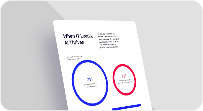 When IT Leads, IT can more effectively foster a company culture that embraces AI’s emerging AI Thrives capabilities when it also has a greater share of platform responsibility. Who understands the benefits of AI? 39% 28% Companies where IT Companies where IT owns Salesforce does not own Salesforce A reactive approach to innovation is a losing strategy to keep pace with customers’ expectations in the digital business era. Today, IT is facilitating business transformation as an internal innovation partner to foster better customer experiences with data-driven insights. Business units are increasingly relying on IT to integrate speed, agility, and the competitive advantage of AI-powered capabilities into how they deliver customer experiences. 16% more employees understand the opportunity for AI to benefit their business if IT is at the helm of their Salesforce org. While much of IT’s work goes unseen, they’re now at the forefront of driving customer interaction through tech-based initiatives, such as improving data management capabilities for proactive customer engagement and leveraging Salesforce data through advanced analytics. 44 IT The State of Salesforce